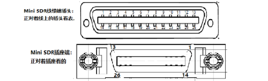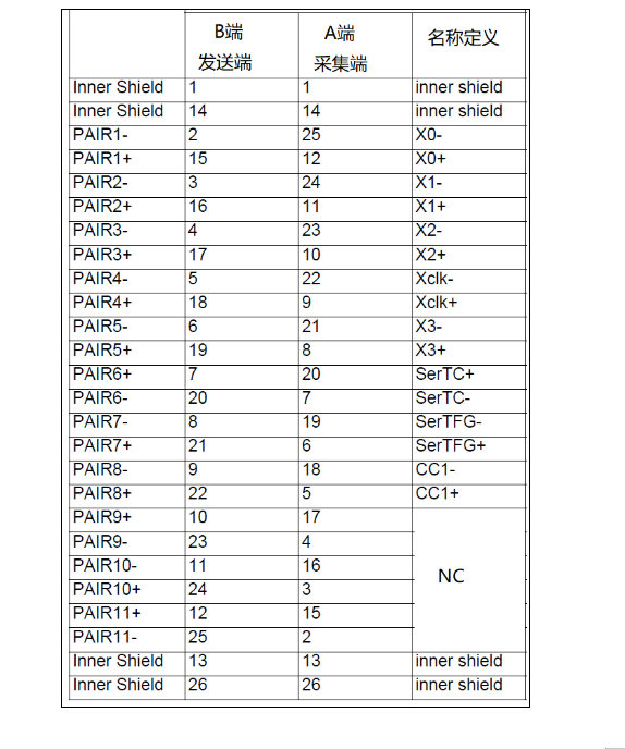 A端和B端都是Mini SDR 26脚插座,符合标准AIA协会定义的Cameralink管脚定义。其针脚顺序如下: